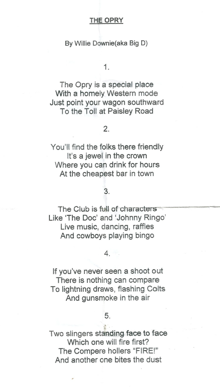 We  hope you’ll take a minute to read the poem below which we think perfectly captures the spirit of Glasgow’s Grand Ole Opry. Written by long time Opry club member Willie Downie also known as ‘Big D’. Enjoy.